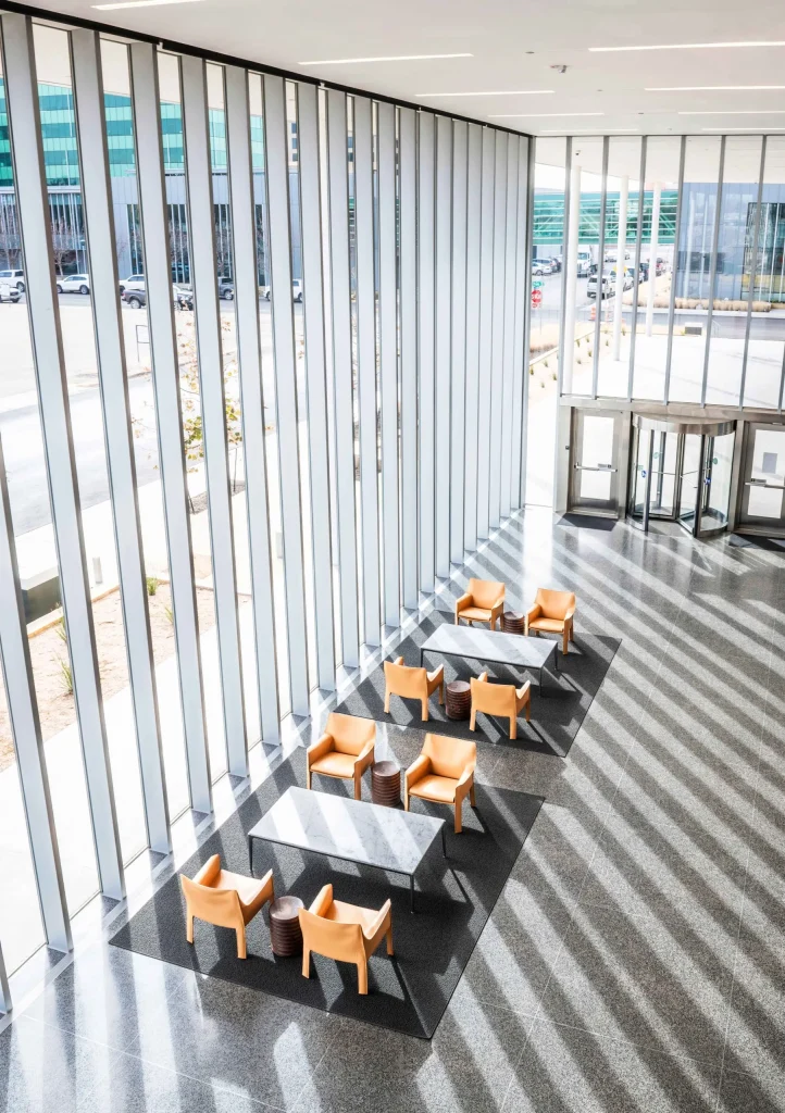 In total, the 3 facades span 140-feet in length by 26-feet in height. Each one of the slim glass panels span 26-feet from floor-to-ceiling, by 2-6″ in width. The total square footage of structural glass measures just over 3,600 square feet. The resulting façades create a stunning echo for the radiant Midland sunsets, with the aluminum fins playing a threefold role as structural, shading and decorative elements. Inside the entrance, their shadows rhythmically dance with the changing position of the sun. Welcoming and stunning, this VetraFin-A system allows for natural light flow and movement throughout the day, and is worth a visit on your next trip to Midland!