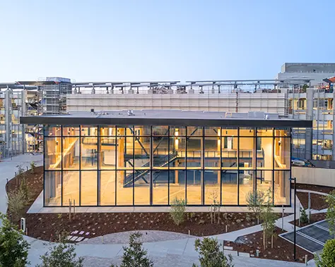 Exposed wood in combination with structural glass, as is on full display in this design, is still in its infancy in the United States. With modern manufacturing technology, the options for and combinations of wood and structural glass are endless. This two-story building in Northern California is characterized by its timber structure and an overall natural warm palette that creates a grand entrance experience and mass timber innovation at the pedestrian scale. The jumbo glass façades flood the building with light with its insulated glass and wood facades climbing over 38 feet in height.