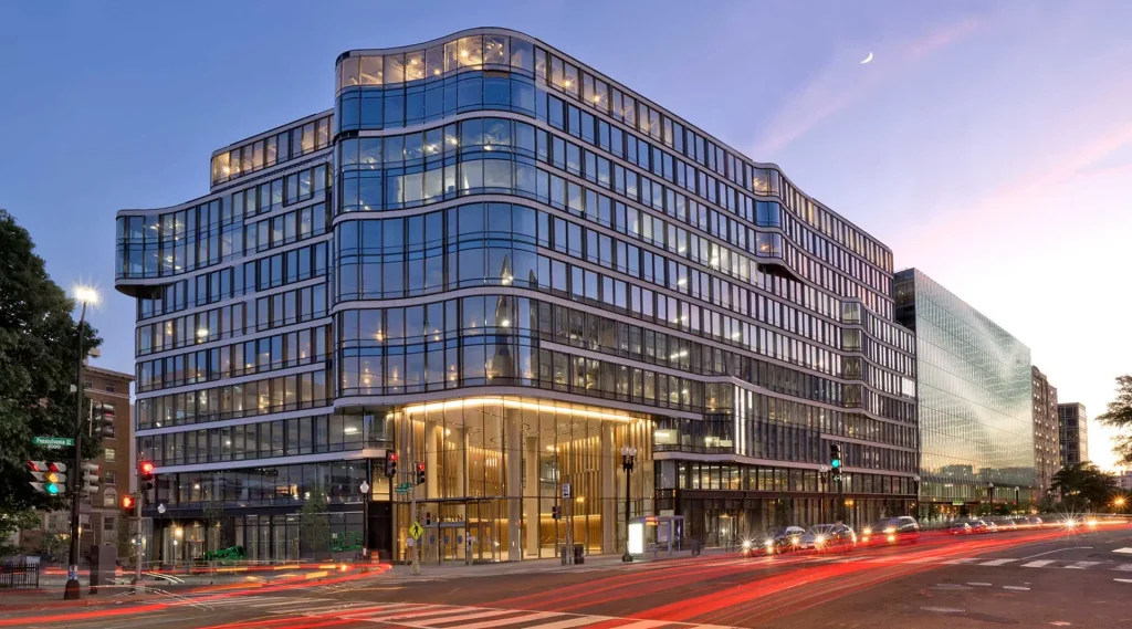 A 33-story office tower located in the heart of San Francisco’s Financial District, the recent renovation includes an enlarged entrance and a seamless, minimalist glass façade that brings more light into the space.
