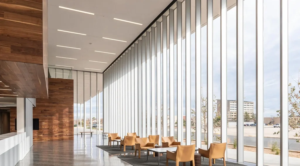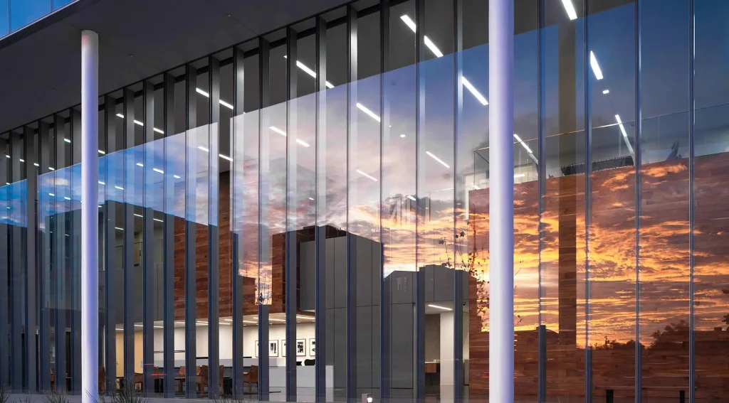 These structural glass façades create a stunning echo for the radiant Midland sunsets, with the 26-foot tall aluminum fins playing a threefold role as structural, shading and decorative elements.