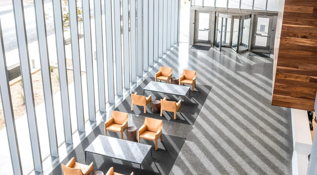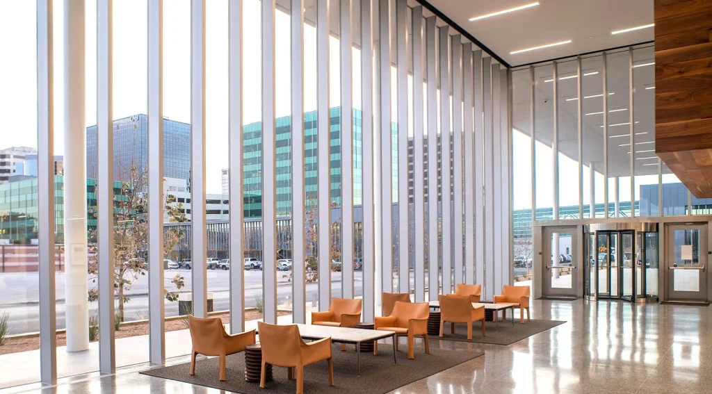 The resulting façades create a stunning echo for the radiant Midland sunsets, with the aluminum fins playing a threefold role as structural, shading and decorative elements. Inside the entrance, their shadows rhythmically dance with the changing position of the sun. Welcoming and stunning, this VetraFin-A system allows for natural light flow and movement throughout the day, and is worth a visit on your next trip to Midland!