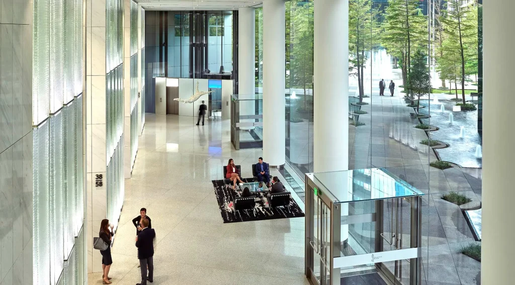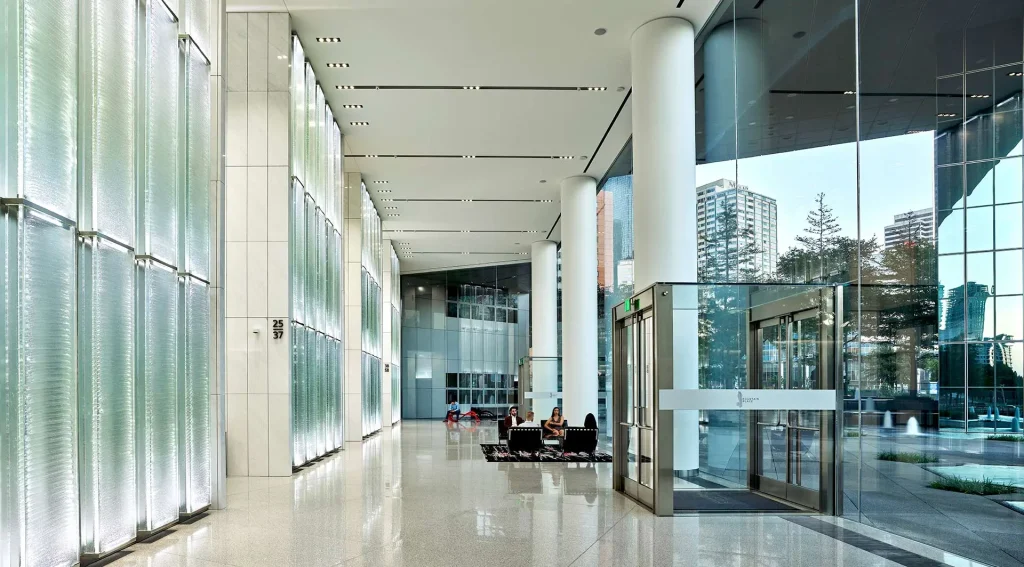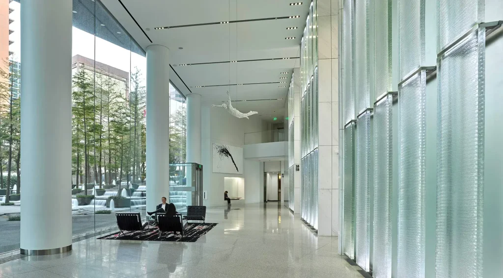 To add to the striking aesthetic, the elevator cores were clad in 9′-high panels of cast glass, creating feature walls that draw the eye and define the space. The lobby features translucent glass that captures and reflects the surrounding cascades of natural light.
