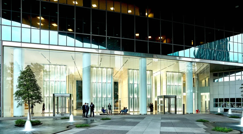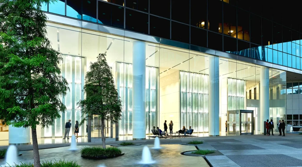 Fountain Place itself is a structure that defines the Dallas skyline. A timeless architectural masterpiece, the $120 million renovation of I.M. Pei and Partner’s iconic 1986 tower ensured that the interiors are as timeless as the iconic exterior, becoming a place where art meets function. The 58-story landmark’s entry experience was transformed by James Carpenter Design Associates in collaboration with executive architect Gensler. In an effort to increase the connection between the interior entrance lobbies and Dan Kiley’s famous outdoor water gardens, the original mezzanines were removed to make way for the new structural glass façade and lobby enclosure walls. Utilizing Sentech’s VetraSpan all-glass façade system, the low-iron glass panels spans 29′-6″ from floor-to-ceiling and over 10′ in width. The resulting monumental, 2-story high frameless structural glass walls create transparent and seamless views from the lobby into the garden and beyond, enabling a harmonious transition between the interior and exterior environments.