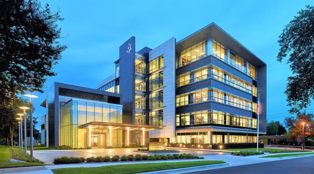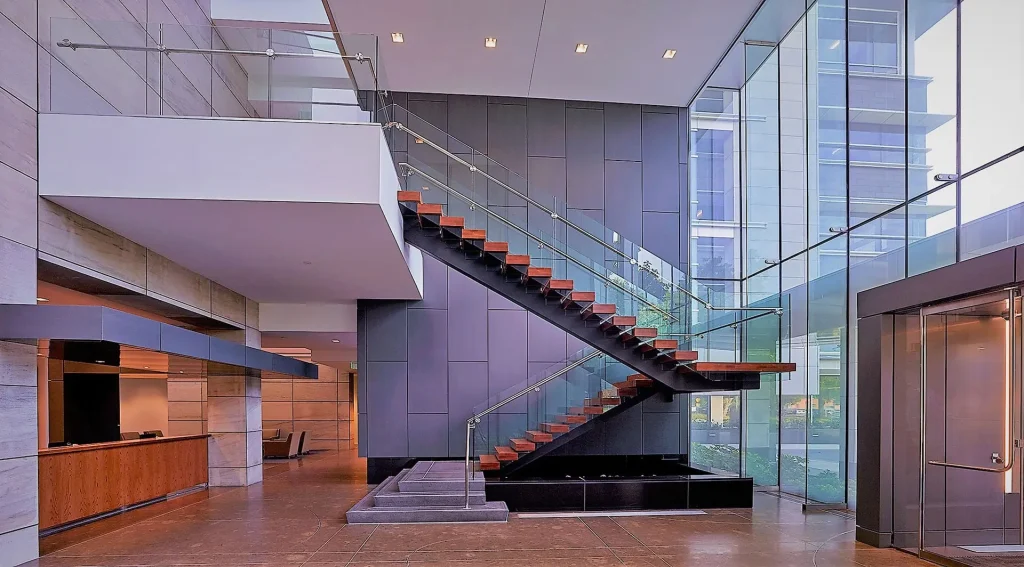 The new Murphy Oil Headquarters proudly displays two VetraFin structural glass walls and one structural glass skylight at the main lobby. This design system boasts oversized low-e coated insulated glass units and single span 30-foot tall glass fins to provide great energy performance without sacrificing transparency.