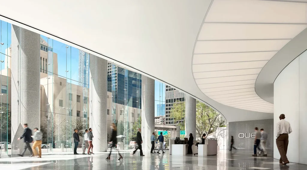 Integration and transparency went hand-in-hand during design and system development, leading to the selection of a dramatic 3-story insulated glass entrance façade that wraps around the lobby and follows the steps that run down the northside, westwards and onto the Metro Station. Designed, engineered and supplied by Sentech, the 2 structural glass walls utilize Sentech’s VetraFin-G system with over 37-foot full-height glass fins that support more than 110 insulated face panels.