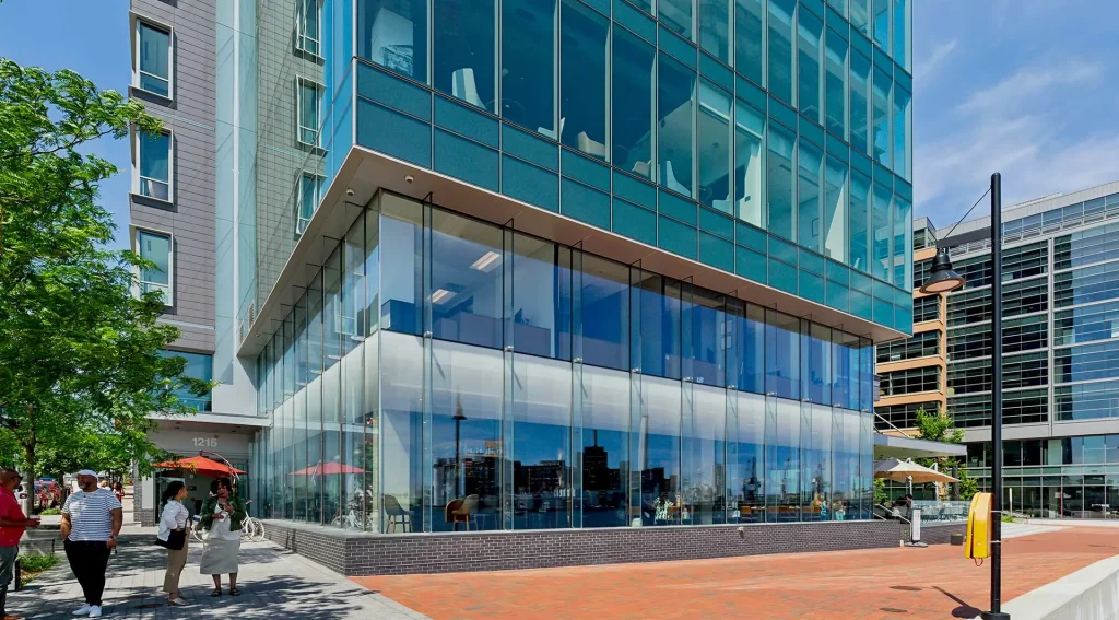 Completed in 2020 and exclusive to Wills Wharf, Baltimore’s first Canopy by Hilton hotel sits on the top four floors of Wills Wharf with a waterfront lobby located directly facing the waterfront promenade. The Canopy hotel’s glass façade entry utilizes Sentech’s VetraFin-G system and over 3,000 square feet of structural glass fin façade, featuring triple laminated glass fins and oversized, low-iron high-performance face glass with a triple silver low-e coating. The elegant, open façade spans 60’ long and 23’ high, blurring the boundary between interior and exterior and offering limitless views of the surrounding harbor.
