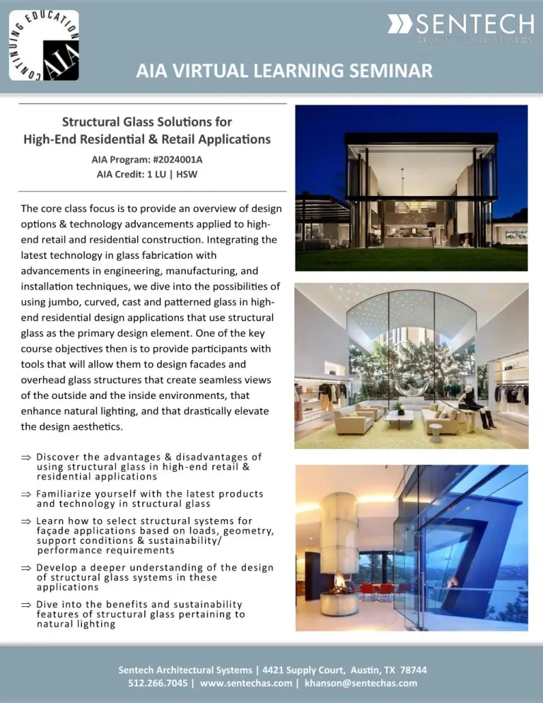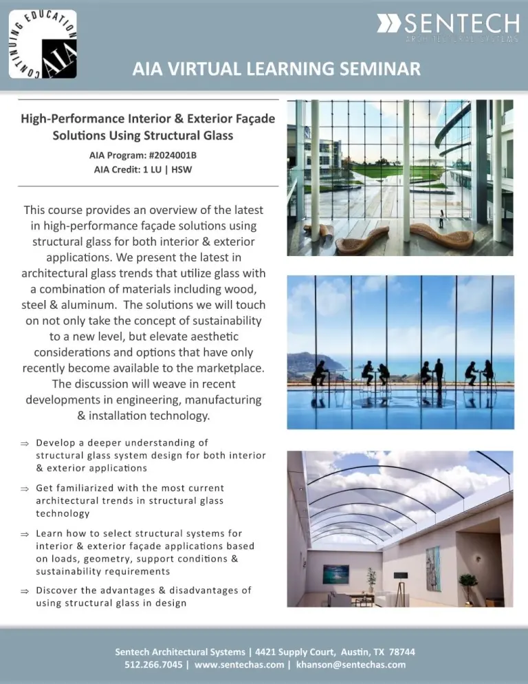 2024 is in full swing! And with it, our newest presentation offerings to architects across the country. Our AIA-accredited virtual seminars, which are approved for 1 AIA HSW CEU each, are designed to be interactive deep-dives into the most current advances and trends in structural glass technology and design, complete with project case studies. More information on each session below. If you are interested in booking session for your team, please reach out to Kathryn Hanson @ khanson@sentechas.com– we would love to bring our seminars to your team.